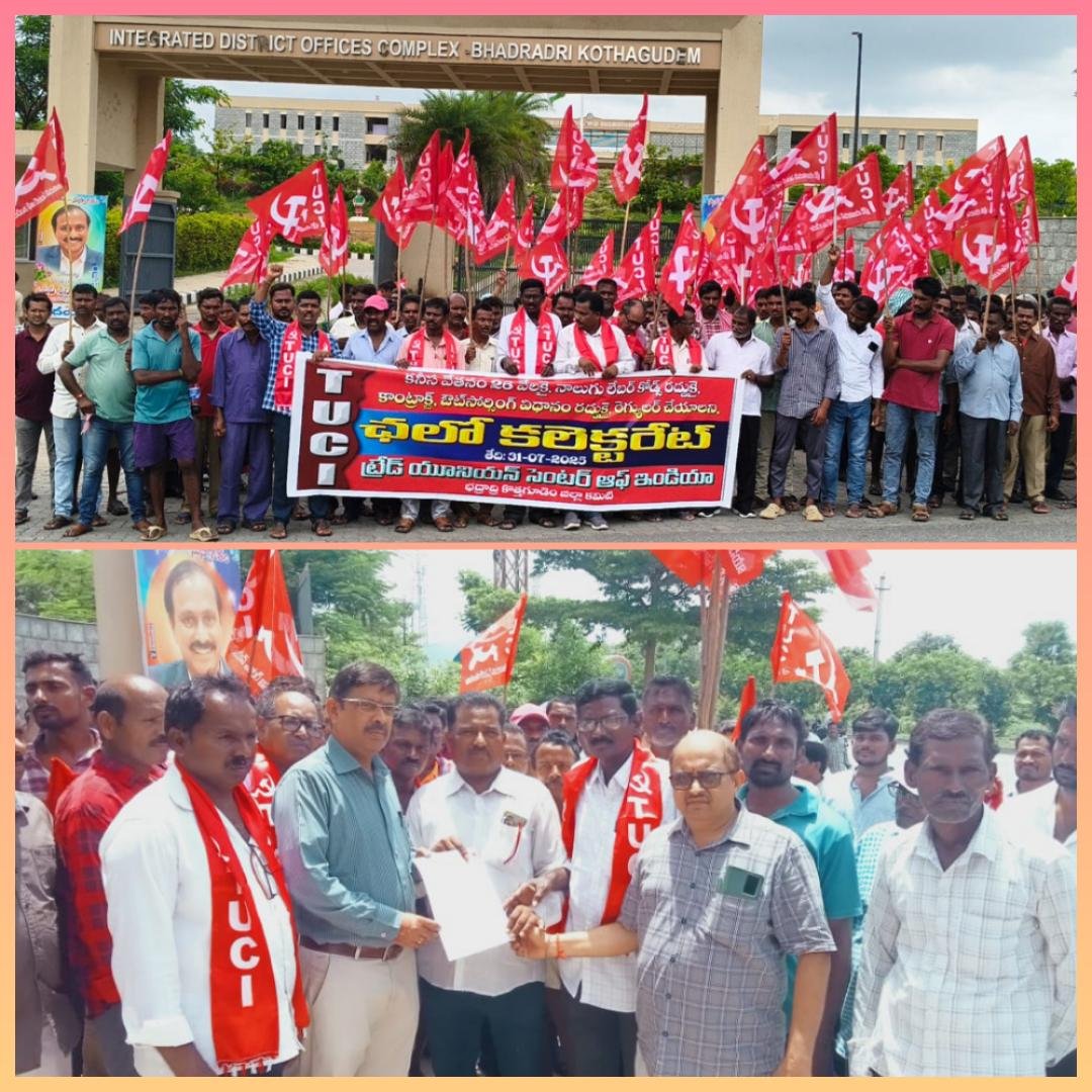 ట్రేడ్ యూనియన్ సెంటర్ ఆఫ్ ఇండియా – టియుసిఐ రాష్ట్ర మహాసభ పిలుపులో భాగంగా ఈరోజు భద్రాద్రి కొత్తగూడెం జిల్లా కమిటీ ఆధ్వర్యంలో ఈరోజు పాల్వంచ లోని నవభారత్ సెంటర్ నుండి జిల్లా కలెక్టర్ గారి కార్యాలయం వరకు ప్రదర్శన నిర్వహించి అనంతరం ధర్నా నిర్వహించారు.
