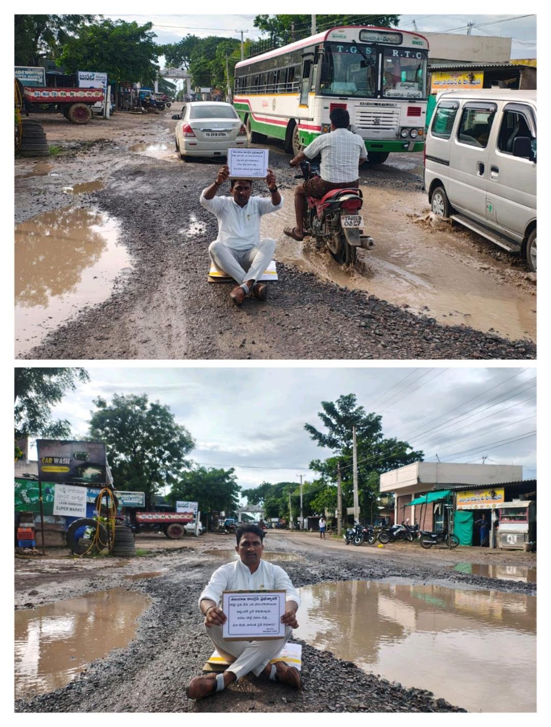 ఎందరో ప్రమాదాల బారిన పడ్డారని, రోడ్డుపై గుంతల మధ్య బైఠాయించి నిరసన తెలిపారు.